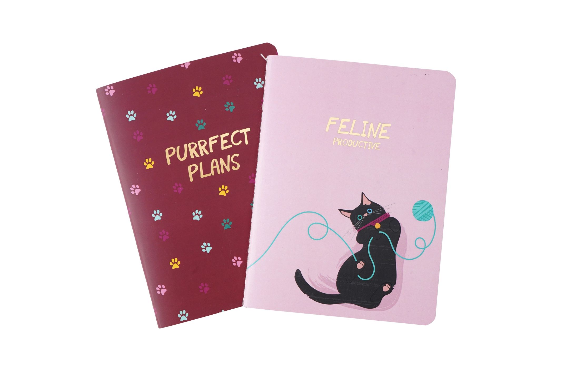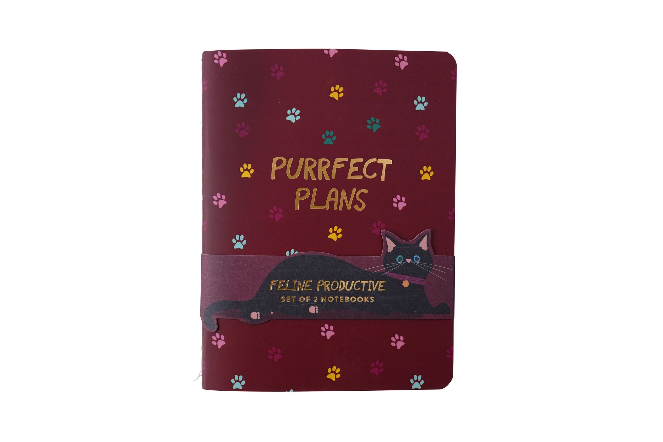 Receive 1 x pink notebook with the slogan ‘Feline Productive’ and 1 x burgundy notebook with an all over cat paw print with the slogan ‘Purrfect Plans’ Handy Handbag Size.